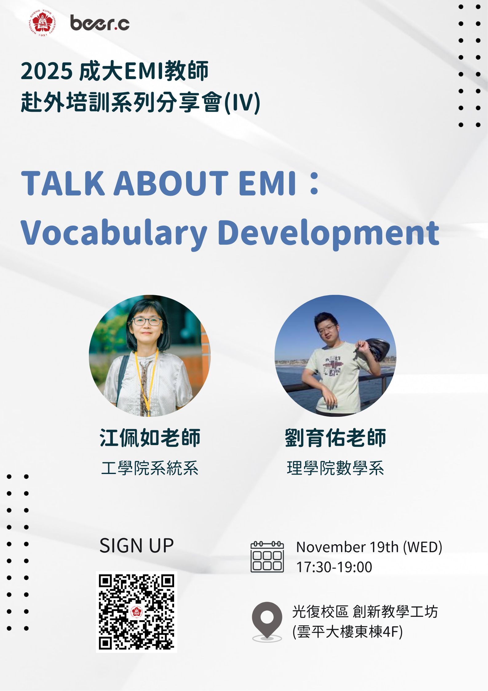 本學期(114-1)將由14位教師接力分享,帶回國際前線的EMI教學趨勢、技巧以及海外培訓心得與實戰經驗 !