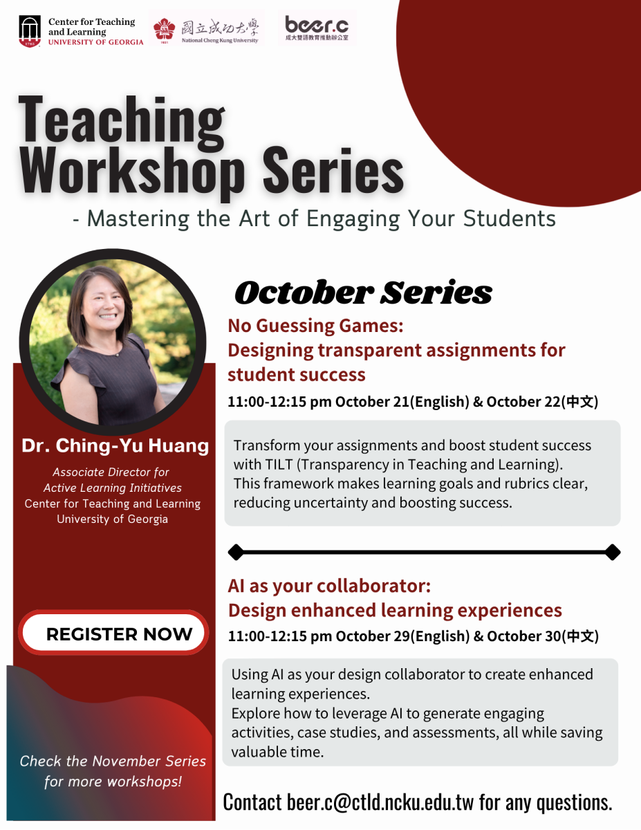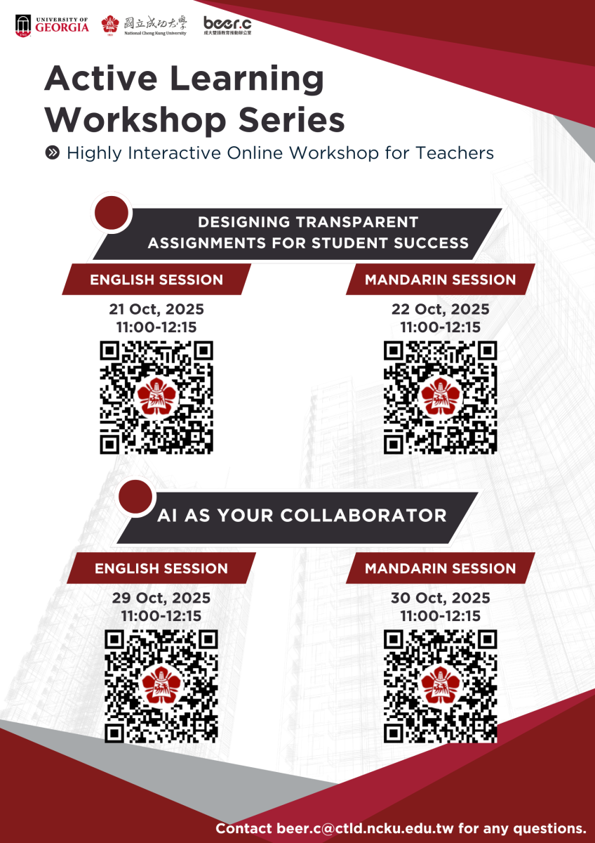 為協助教師運用創新策略提升教學成效,創造更具啟發性的學習體驗,本校雙語教育推動辦公室(BEER.c)今年再度與美國喬治亞大學教學與學習中心合作,推出全新主題的 線上EMI教師工作坊(Active Learning Workshop Series for Teachers)!
